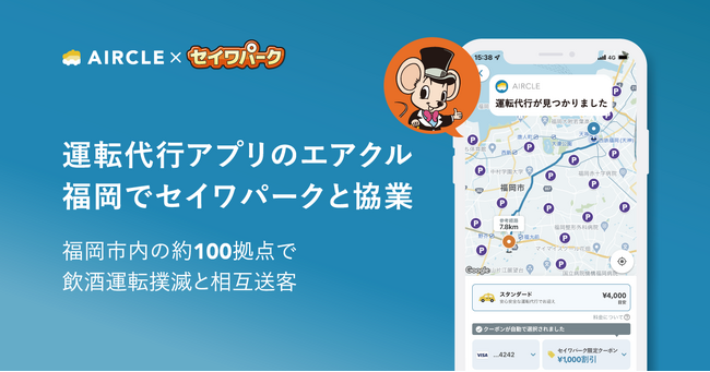株式会社Alpaca.Lab(所在地:沖縄県中城村、代表取締役:棚原生磨、以下当社)が展開する運転代行配車プラットフォーム「AIRCLE(エアクル)」は、福岡県内における飲酒運転撲滅と販促活動の協力、相互送客を目的とし、セイワパーク株式会社(所在地:福岡県福岡市、代表取締役社長:清家政彦、以下セイワパーク)との協業を開始します。