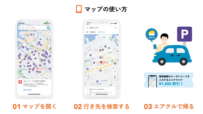 本施策は、セイワパークの対象駐車場(約100拠点)に設置されたクーポンコードをエアクルアプリに入力することで、運転代行を通常より安く利用できる特典を提供します。対象駐車場は、エアクルアプリの特典ページに表示されたGoogle Mapにて確認できます。