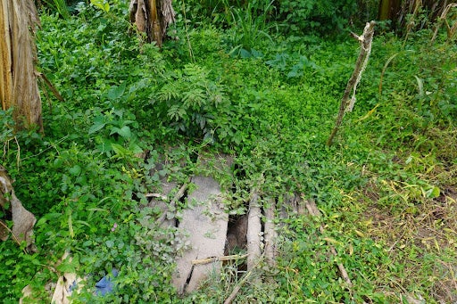 「この家では、屋外で用を足したり、写真のように地面に穴を掘り、その上にただ木の板を乗せてトイレ替わりにしていたりします。」
