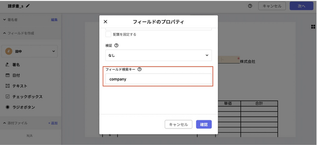 ※フィールド検索キーを利用するには、事前に設定をする必要があり、すでに署名が完了しているドキュメントにはフィールド検索キーはご利用いただけません。