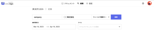 相手方(◯◯株式会社)の署名が完了した後、フィールド検索機能を活用することで「company = ◯◯株式会社」と検索し、対象の書類をすぐに検索することが可能となります。