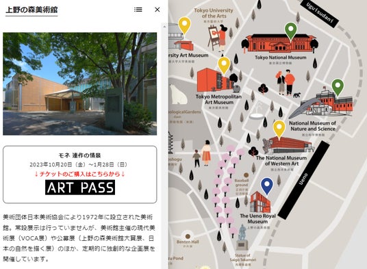 モダンなイラストマップは、土地勘がないインバウンド観光客でも感覚的に位置関係を把握しやすく、ページ上から直接展覧会チケットをART PASSの販売ページを通じて購入・予約できます。また、イラストマップからGoogleマップに切り替えもでき、地理情報を正確に把握することも可能です。
