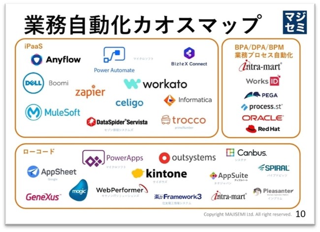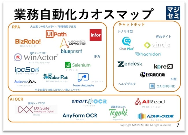ウェビナーマーケティング・サービス「マジセミ」を提供するマジセミ株式会社(本社:東京都港区、代表取締役:寺田雄一、以下マジセミ)は、「業務自動化」のカテゴリを整理、分類したマップを作成し、それぞれのカテゴリについての解説と、いくつかのツールを紹介するコンテンツ「業務自動化カオスマップ」を作成しました。