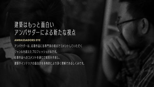 本アワードのアンバサダーを務めるのは、さまざまなジャンルで活躍するプロフェッショナル。それぞれの視点で応募作品へのコメントが寄せられ、それらもウェブサイト上で公開されます。これにより、建築やインテリアのおもしろさを多角的に伝え、本アワードを応援する一般の人々が作品をより深く理解することができます。