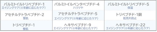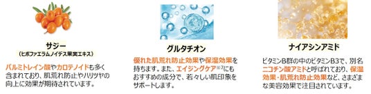 ※1 シリカ(整肌)、※2 アスコルビン酸(保湿)、※3 角質層まで、※4 ヒポファエラムノイデス果実エキス(配合目的:整肌)、※5 トリペプチド-1、アセチルテトラペプチド-5、トリペプチド-1銅、パルミトイルトリペプチド-1、ヘキサペプチド-9、ヘキサペプチド-22、アセチルテトラペプチド-2、パルミトイルペンタペプチド-4、パルミトイルトリペプチド-5(配合目的:肌コンディショニング剤)、※6 ヒアルロン酸Na、加水分解ムコ多糖、ヒアルロン酸クロスポリマーNa、加水分解ヒアルロン酸、ヒアルロン酸ヒドロキシプロピルトリモニウム、ヒアルロン酸、アセチルヒアルロン酸Na(配合目的:すべて保湿)、※7 年齢に応じたケア