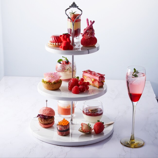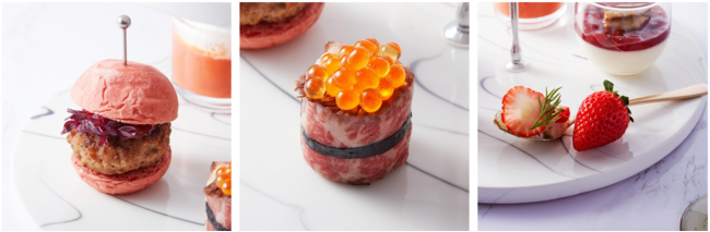 ストロベリーモヒートのウェルカムドリンクをはじめ、苺のミルフィーユやタルトなど、苺づくしのスイーツが盛りだくさん。こだわりのセイボリープレートには、鹿児島県産A5黒牛を使用した“ローストビーフ寿司とイクラ”や、“鴨肉パティのミニバーガー” 等、ストロベリーカラーのメニューが並びます。
