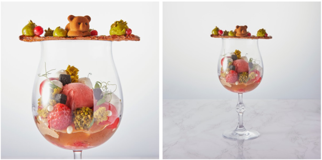 LOUANGE TOKYO Le Muséeのクリスタルシリーズ、新作は贅沢な苺のパルフェ。バカラグラス「パッション」の中では、国産苺をシャンパーニュ・ロゼでマリネし、オレンジとアールグレイのジュレ、ロイヤルミルクティーのわらび餅、ピスタチオ、炭と紅茶のクランブルが、複雑に混ざり合い特別なマリアージュを演出しています。トップのキャラメリゼしたパイ生地にはピスタチオクリームとヌーミーを添え、可愛らしく仕上げました。