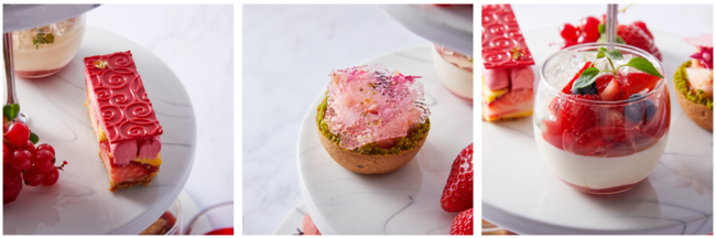 白いちご -淡雪-のタルト / 赤い果実とピスタチオクリームのヴェリーヌ / ピスタチオクリームとラズベリージャムのシュー