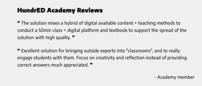 「外の世界の専門家を "教室 "に招き、生徒と彼らの関わりをつくる素晴らしいソリューションです。正解を提示するのではなく、創造性と内省に重きをおいている点が非常に評価できます。」