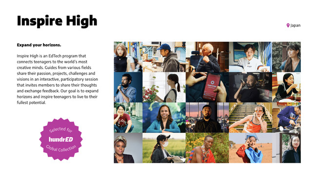 Inspire Highでは、世界中で自分らしく活躍する大人たちと「答えのない問い」について考え、同世代で共有し合う双方向型の学びを提供しています。10代に多様なインスピレーションを届けている、世界の中でも類似がないEdTechイノベーションであることが評価され、選出に至りました。