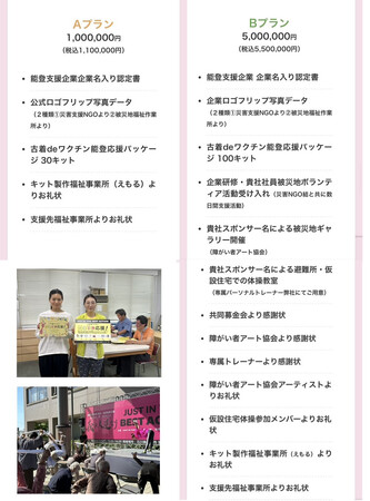 Aプラン(1,000,000円)Bプラン(5,000,000円)となり、被災地の支援と同時に企業の社会的地位向上を図ることが可能です。
