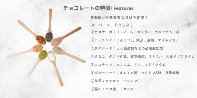 チョコレートの原料のカカオ豆に加え、アーモンド、きなこ、チアシード、ココナツ、ケシの実、抹茶、昆布などの栄養たっぷりの食材をふんだんに使用し、栄養価を最大まで高めた完全食チョコレート。