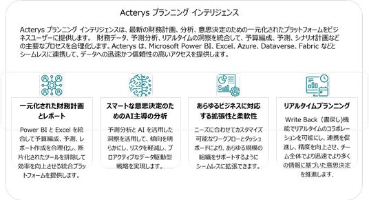 Acterysは、組織がデータを行動に変える方法に革命をもたらします。同社のデータ駆動型の反復的なソフトウェアアプローチは、Microsoft FabricとPower BIに最も強力でシームレスなエンタープライズライトバックとワークフロー拡張機能を追加することで強化し、顧客がよりスマートでAI対応のソリューションをより迅速に構築できるようにします。Acterys Data Intelligenceは、企業全体のデータおよびテクノロジーリーダーが、既存のエンタープライズシステムとシームレスに統合できる、カスタマイズ可能でスケーラブルなアプリケーションを作成できるように支援します。一方、Acterys Planning Intelligenceは、CFOオフィスに、予算編成、計画、予測、分析、レポートを統合する集中型プラットフォームを提供します。Acterysは2011年に、Managility Pty Limited社によって設立され、米国、EMEA、APACにオフィスを構えています。