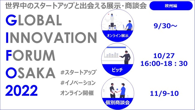 大阪商工会議所は、日本企業の海外スタートアップとのコラボレーションを促進するため、世界のスタートアップと出会える展示・商談会【グローバル・イノベーション・フォーラム大阪 (GIF)2022】をオンラインで開催いたします。イギリス・オランダ・スイス・ドイツ・フランスからグリーンテック、新素材、スポーツテックなどの分野でユニークな技術を持つスタートアップ8社が登壇します。10/27(木)にはピッチ、11/9(水)、10(木)に1 on 1のビジネスミーティングを開催します。