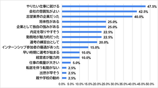 最も多かったのが「やりたい仕事に就ける」19名(47.5%)、次いで「会社の雰囲気がよい」17名(42.5%)、「志望業界の企業だった」16名(40.0%)だった。