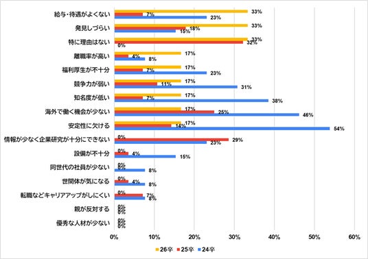 24卒は「安定性に欠ける」(54.0%)を半数以上が選択しており、大きな懸念事項になっていたことが窺える。25・26卒は減少傾向にあるため、24卒はコロナ禍による経営悪化を案じていたのではないかと考えられる。