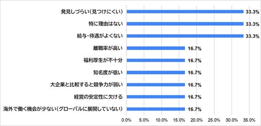 最も多かったのが、「発見しづらい(見つけにくい)」「特に理由はない」「給与・待遇がよくない」2名(33.3%)だった。