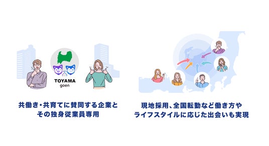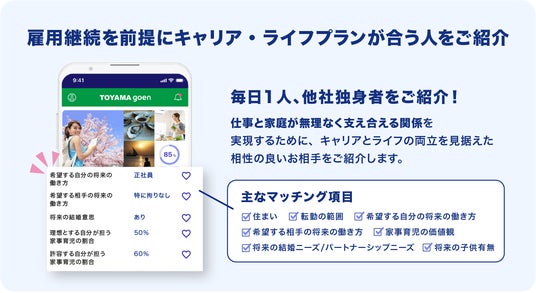 株式会社Aill(エール)(代表取締役社長:豊嶋千奈、以下Aill)は、富山県(知事:新田八朗)と共同で、富山県が承認する共働き・共育てを応援する企業・団体・事業所の従業員専用となるAI縁結びアプリ「TOYAMA goen(トヤマ ゴエン)」の運用を開始します。本事業は、企業等専用AI縁結びアプリを県が導入する全国初の取り組みであり、出会いや結婚の希望を叶えるとともに、若手人材の確保・定着、人的資本経営、従業員のウェルビーイング向上を後押しすることを目的としています。