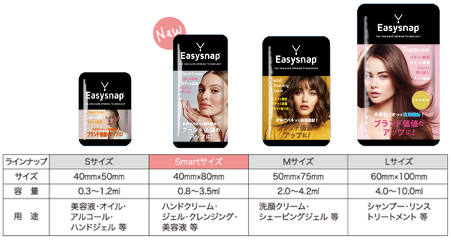当社はこれまで Easysnap(R)のサイズラインナップとして、S(40mm×50mm、容量 0.3~1.2ml)、M(50mm×75mm、容量 2.0~4.2ml)、L(60mm×100mm、容量 4.0~10.0ml)の3サイズを展開してまいりましたが、この度、新たに Smart サイズ(40mm×80mm、容量 0.8~3.5ml)をラインナップに加えることとなりました。