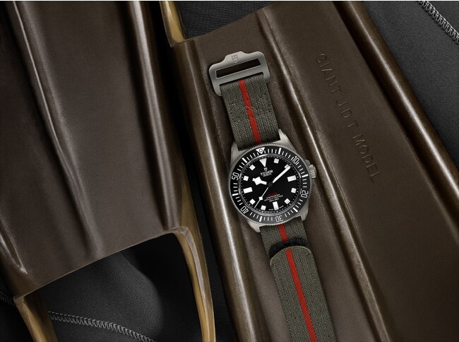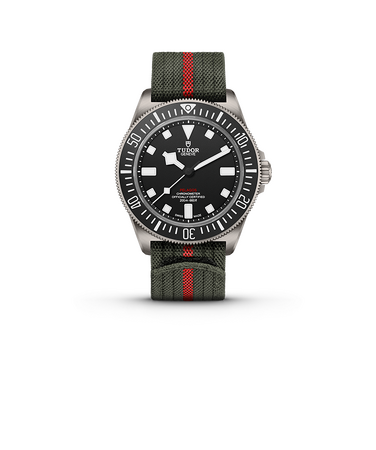 チューダーは2010年にいち早くファブリックストラップを採用して以来、常に先駆者であり続けている。フランスのサン・テティエンヌで150年以上家族経営を続けるジュリアン・フォール社によって、19世紀製の織機を用いて生み出されるファブリックストラップ。それは品質と快適さを両立する唯一無二の存在である。ペラゴス FXDのためにジュリアン・フォールとチューダーは、新しい構造のストラップを開発した。中央にレッドのラインが入ったフォレストグリーンのナイロン製織りリボン(幅22mm)にセルフグリップ着脱システムを組み合わせた新ストラップは、あらゆる手首に快適にフィットする。