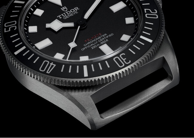新しいペラゴス FXDの意匠は、60年代後半から80年代前半にかけてアメリカ海軍の隊員たちが着用していたチューダーのダイバーズウォッチを着想源としている。時計全体のカラーはブラック。そして暗闇の使用でも発光強度を最大化させるために1969年に導入された、スクエアが先端に付いた「スノーフレーク」針やスクエア型アワーマーカー。他にも、発光塗料を用いたサンドブラスト仕上げのセラミック製インサートと逆回転防止ベゼルを採用している。さらに、42mm径チタニウム製ケース全体にサテン仕上げを施し、そのマットな質感によって光の反射を制限している。