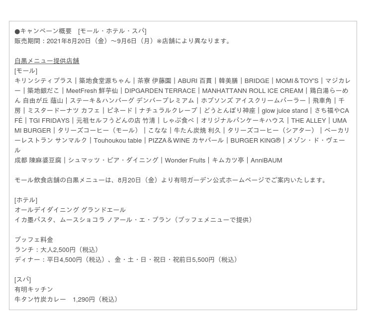 有明ガーデンのモール・スパ・ホテルが黒(96)く染まる期間限定イベント!黒湯、黒部屋、白黒フードなど、複合商業施設だからこそできる、全施設参加の大規模な黒フェスキャンペーンでみんな黒く染まろう!