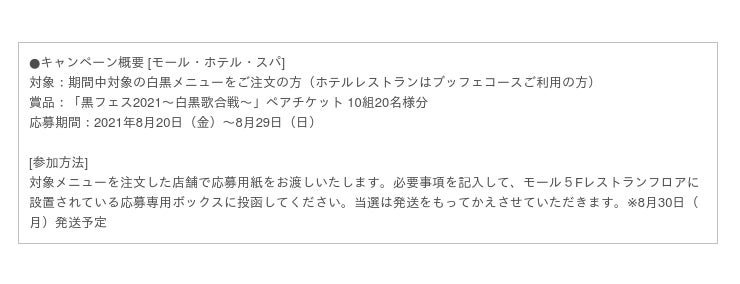 期間中対象の白黒メニューをご注文の方に、「黒フェス2021~白黒歌合戦~」のペアチケットを抽選でプレゼントいたします。黒フェスが気になっている方、チャンスです!