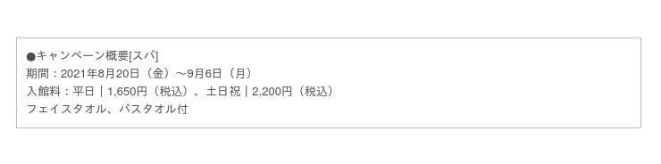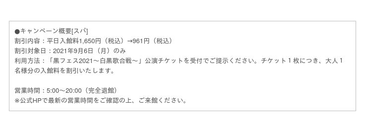 「⿊フェス2021~⽩⿊歌合戦~」の公演チケット提示で、入館料が961円に!⿊フェスに来場されるお客様には見逃せないサービスです!価格もお風呂も⿊く染まるスパで⿊フェスを楽しみ尽くそう!