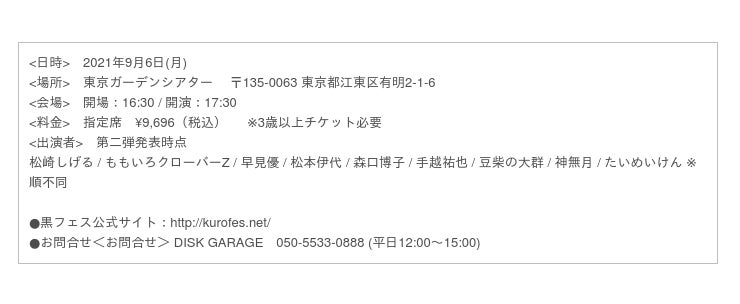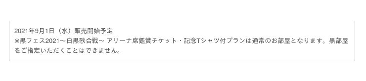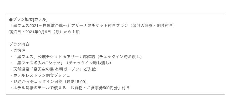 「⿊フェス」アリーナ席お約束!公演チケット+記念Tシャツ付宿泊プラン