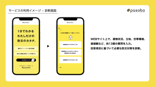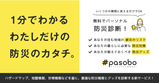 そこで私たちは、WEB上で、いくつかの質問に回答するだけで、自分に必要な防災対策が1分でみつかるサービス「パーソナル防災サービス#pasobo(パソボ)」を提供しています。