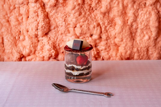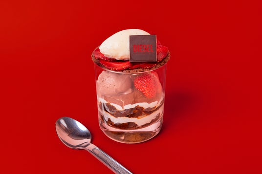 今回のコラボレーションメニューでは、当店のシグネチャーデザート「ティラミス」をベースにしたパフェに旬のいちごやアイスクリームを盛り付け、DIESELのロゴが施されたDARCISのダークチョコレートコーティングの伝統的なヘーゼルナッツプラリネ「プラリネランシェンヌ」を添えました。