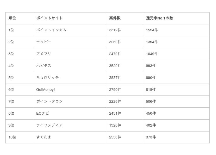 今回のポイントサイトランキングは、当サービスに登録してある案件データを元に、還元率No.1案件(他のサイトよりも一番高い広告案件の数)の数で順位を決定しています。