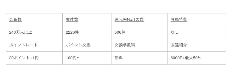 ということで、「還元率が一番高い広告案件の数」を中心にポイントサイトランキングを紹介して来ました。