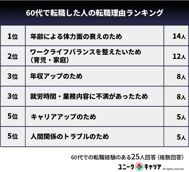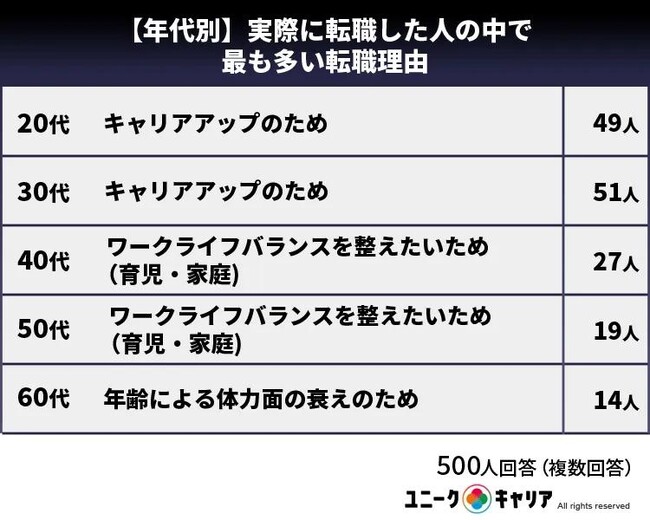 転職理由として、20代から30代は「キャリアアップのため」が多く、50代や60代では「体力面の衰え」が目立った。