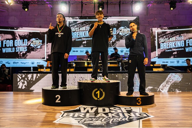 公益社団法人日本ダンススポーツ連盟(略称JDSF)は、2023年8月31日から1日にかけてポルトガルのポルトで開催されたWDSF Breaking for Gold World Series in Portugal(以下、BfG WS ポルトガル)において、ブレイキン強化選手を派遣しました。この大会を含むBreaking for Goldで獲得したポイントで、2024年3月から6月にかけて行われるオリンピック・クオリファイヤー・イベントシリーズ(以下、OQS)への出場権を獲得することができます。男子部門には108人、女子部門には88人の選手が予選として行われた1日目のプレセレクションから、2日目の決勝トーナメントまで戦いました。日本代表として、SHIGEKIX選手(半井重幸)金メダルを獲得しOQSポイント1000ポイントを獲得し、OQSランキングと世界ランキングともに2位となりました。その他に、男子部門ではISSIN選手(菱川一心)が8位、女子部門ではAYANE選手(半井彩弥)が6位、RIKO選手(津波古梨心)が7位となりました。