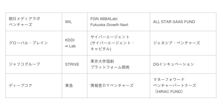 今回、選考を行ったVC・企業(CVC)は下記となります。(合計16社、順・敬称略)