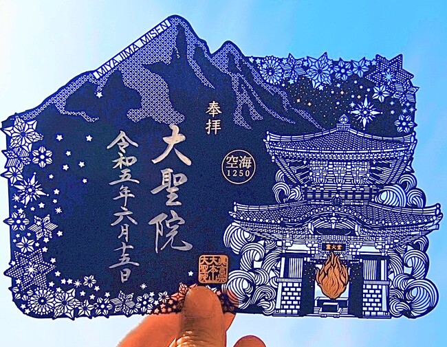 2023年は、宮島弥山を開かれた弘法大師・空海の生誕1250年を迎える年です。空海は806年に弥山に登り修行を行いました。その時の残り火は今日まで「消えずの火」として「不消霊火堂」で守り継がれています。この記念御朱印は、空海ゆかりの弥山と不消霊火堂を細やかな切り絵で表現し、ゴールドとシルバーの豪華な箔押しで奉製いたしました。