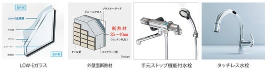 本物件は、「ZEH-M Oriented」認証しています。ZEH-M Orientedとは、建物の断熱性能を大幅に向上させるとともに高効率な設備システムを導入し、室内環境の質を維持しつつ大幅な省エネを実現することで、マンション全体での年間一次エネルギー消費量を20%以上削減することを目指したマンションです。省エネ性と断熱性を高めるために「LOW-Eガラス」をはじめ、「外壁面断熱材」、節水効果が見込める「手元ストップ機能付水栓」や「タッチレス水栓」を採用し、BELSによる建築物の省エネ性能評価書を取得しました。