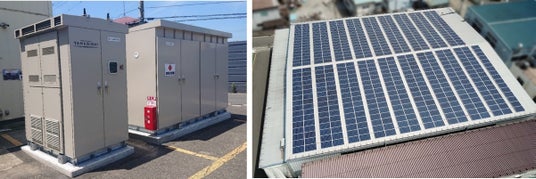 神奈川県海老名市の自社工場にて稼働中の蓄電システム「YRW-2000シリーズ」と太陽光発電 (パワコン出力100kW・蓄電池容量426kWh・太陽光発電162kW) ※試作の為、製品版と異なります