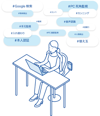 PCカメラに加えてスマートフォンのカメラを監視に用いることで、多くの不正の温床となるPCカメラの死角をカバーします。