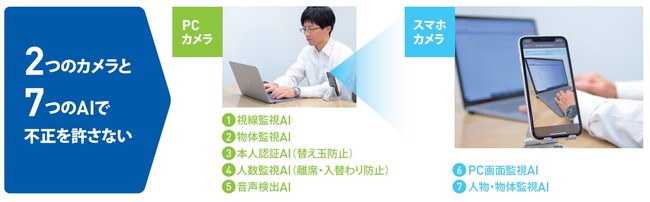 PCカメラの他にスマートフォンカメラを使用することでPCカメラの死角を監視し、7つのAIを駆使することでカンニングや替え玉などの不正行為を抑止・監視・検知します。