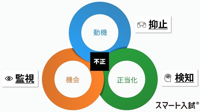 スマート入試では「入試におけるカンニング行為」を「組織における内部不正」と同等に捉えており、「不正のトライアングル理論」(※)を基に、不正の三要素を排除するよう構築されています。