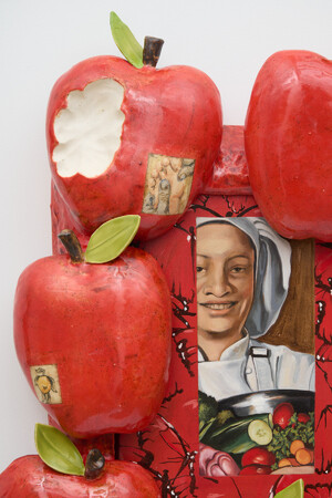 ステファニー・ハイエは、オランダ黄金時代などの伝統的な様式を参照した絵画にセラミック彫刻を組み合わせた半立体的な作品で知られます。現代美術とクラフト、あるいは平面と立体といった、従来の美術におけるメディウムの境界に妨げられることなく、食べることの楽しみと消費のグロテスク、そしてモチーフの親しみやすさとその反面の不穏さや不協和を、遊び心をもって表現しています。