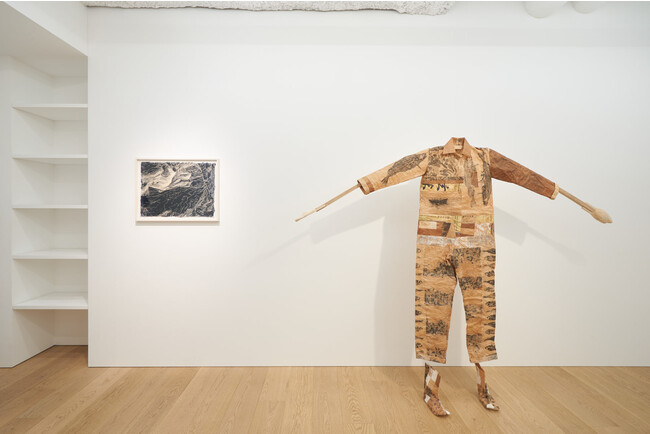 日系カナダ人であるアレクサ・ハタナカは、日本の生活や慣習に根付いた伝統的な天然染色や製紙、工芸などの素材や技術を用いて、受け継がれる儀式や衣装、生活用品を作り、美術作品に昇華しています。出展作品のひとつである「Yoshitaka Boiler Suits」では、漁業に従事した祖父たちが築いてきた海との親密な関係を魚拓を用いることによって表現しています。他方で、リノカット・レリーフプリントという版画技法で製作された「Looks Like Water」では、北極圏の雪の大地に現れる波状の模様を表現します。本作は雪が作りだす「波」の模様に、祖父たちが見つめてきた海の姿と、その雪が気候変動の影響でやがて海水になっていく運命を重ね合わせたイメージと言えるでしょう。