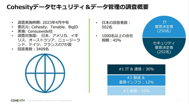 本調査について: 本結果は、日本のITおよびセキュリティ運用 (SecOps) の意思決定者502名 (両者の割合はほぼ半々) を対象にCohesityが2023年4月末に実施した調査に基づいています。回答者は日本の組織から選ばれ、以下が最も多かった業種です: ITと通信 (30%)、製造と公共 (12%)、金融 (10%)。Cohesity、Tenable、BigIDの委託によりCensuswideが実施した本調査から得られたさらなる結果と洞察を盛り込んだ「CohesityのGlobal 2023 State of Data Security & Management」レポートは、7月下旬に発表される予定です。