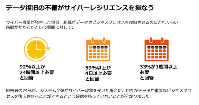 有害なサイバーインシデントが発生した場合でも、事業を継続することは極めて重要ですが、データの復旧やビジネスプロセスの復元を迅速に行う能力がないと組織の対応は遅くなります。サイバー攻撃が発生した場合、自社のデータやビジネスプロセスの復旧にどれくらいの時間がかかるか? という質問に対して、92%以上の回答者が24時間以上、59%が4日以上、3分の1 (33%) が1週間以上かかると回答しました。