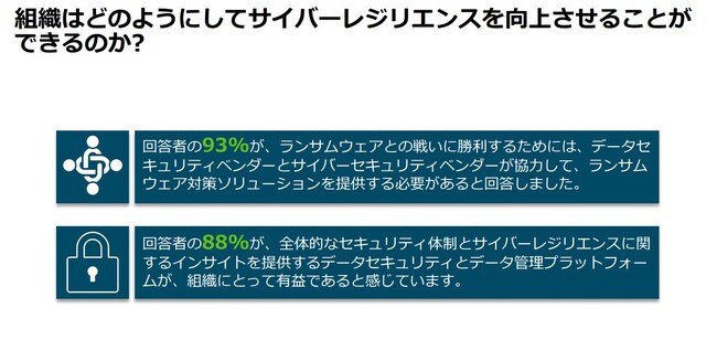 その結果として、回答者の93%が、ランサムウェアとの戦いに勝つためには、データベンダーとサイバーセキュリティベンダーが協力して、完全かつ統合されたランサムウェア対策ソリューションを提供する必要があると回答し、回答者の88%が、セキュリティ体制全体とサイバーレジリエンスに関するインサイトを提供するデータセキュリティとデータ管理プラットフォームは、自社にとって有益であると感じています。