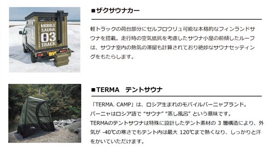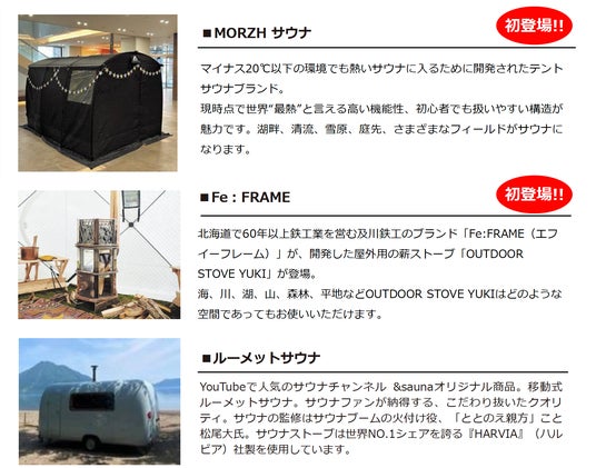 1. 道内の様々なサウナが集結!香り・温度など「選ぶ楽しさの提供」道内の10種以上のサウナが今年も会場に集結します!温度、湿度、見た目、ブランド、珍しさ