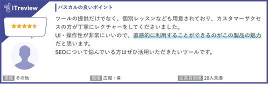 ITreviewにて、パスカルを実際に利用いただいているお客様よりたくさんのお声をいただいております。お客様からは「使いやすいツール」「改善点がわかりやすい」などのコメントをいただきました。