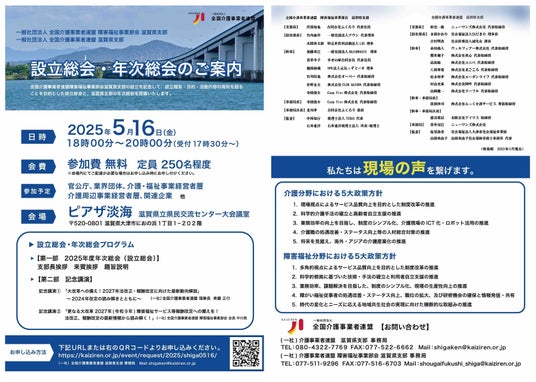滋賀支部の設立を記念し、2025年5月16日(金)に設立総会を開催 いたします。 この総会では、全介連の活動方針や滋賀支部の具体的な取り組みについてご説明し、県内の介護・障害福祉事業者の皆様と意見交換を行う予定です。